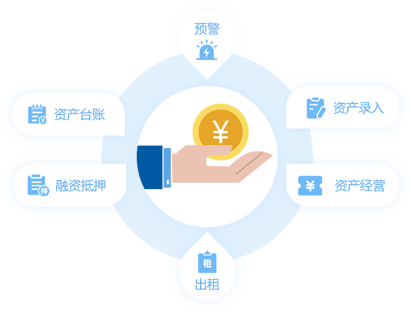 资产经营管理主要包括:资产台账录入申请和审核 、资产录入和经营 申请、融资抵押录入和审核、资产经营列表、出租列表和出租到期提示。